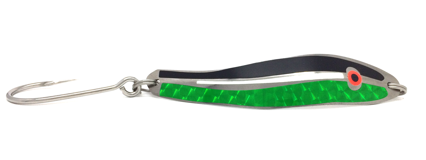 Our 3 main spoon shapes shown in the picture (Lemon Lime) from widest to narrowest is the AP Herring Spoon, AP Anchovy Spoon and AP Sandlance Spoon. The spoons mimic a wounded bait fish and with 2”, 3”, 4” and 5” available in all 3 shapes, along with the 7” AP Herring Spoon and Sea Serpent, we allow the angler to match what ever size bait fish that their target species is preying on.